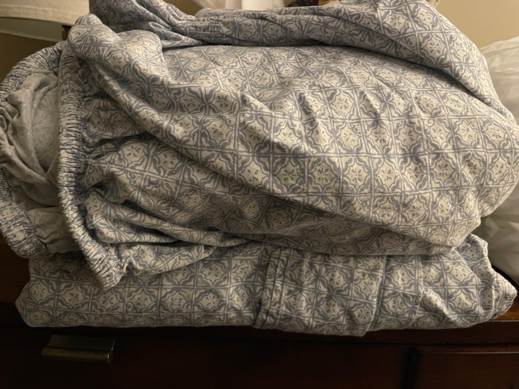 Proudly half-assing folding my fitted sheet. At least it’s folded. Kind of. Also gave 30% effort on the flat sheet. Where are the pillowcases? Your guess is as good as mine. How long have those sheets been waiting to be folded? Two weeks?